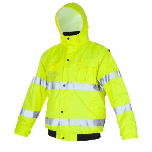 Ocieplana kurtka ochronna wykonana z wodoodpornego materiału 300D poliester Oxford o wysokiej widoczności , impregnowanego PU, w kolorze żółtym fluorescencyjnym z czarnymi wstawkami, poliestrowej ociepliny, od wewnątrz wykończona poliestrową pikowaną podszewką.