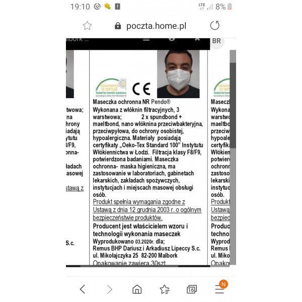 PRZEZNACZENIE Maseczka ochronna - maska higieniczna, ma zastosowanie w laboratoriach, gabinetach lekarskich, zakładach spożywczych, instytucjach i miejscach masowej obsługi osób. Przeznaczona jest do ochrony układu oddechowego przed stałymi i ciekłymi cząsteczkami zabezpiecza użytkownika przed drobnoustrojami, pyłami, alergenami, kurzem, roztoczami, pleśnią, smogiem. Chroni przed wieloma infekcjami dróg oddechowych rozprzestrzeniającymi się kropelkowo.SPOSÓB DZIAŁANIAMaseczka ochronna wykonana z włóknin filtracyjnych - 3 warstwowych, odpornych na przesiąkanie. Kształt maski dostosowany do układu twarzy, mocowana na gumkę zakładaną na głowę, wysoki komfort użytkowania, polecana jest również dla osób z zarostem na twarzy, wszyty clipband dopasowuje maskę. Maska podczas użytkowania winna ściśle przylegać do twarzy. Powietrze wdychane z otoczenia przechodzi przez materiał filtracyjny, gdzie jest oczyszczane. Filtracja przeciwpyłowa i zatrzymująca areozole odpowiada filtrom klasy typu FFP3, potwierdzona badaniami laboratoryjnymi.